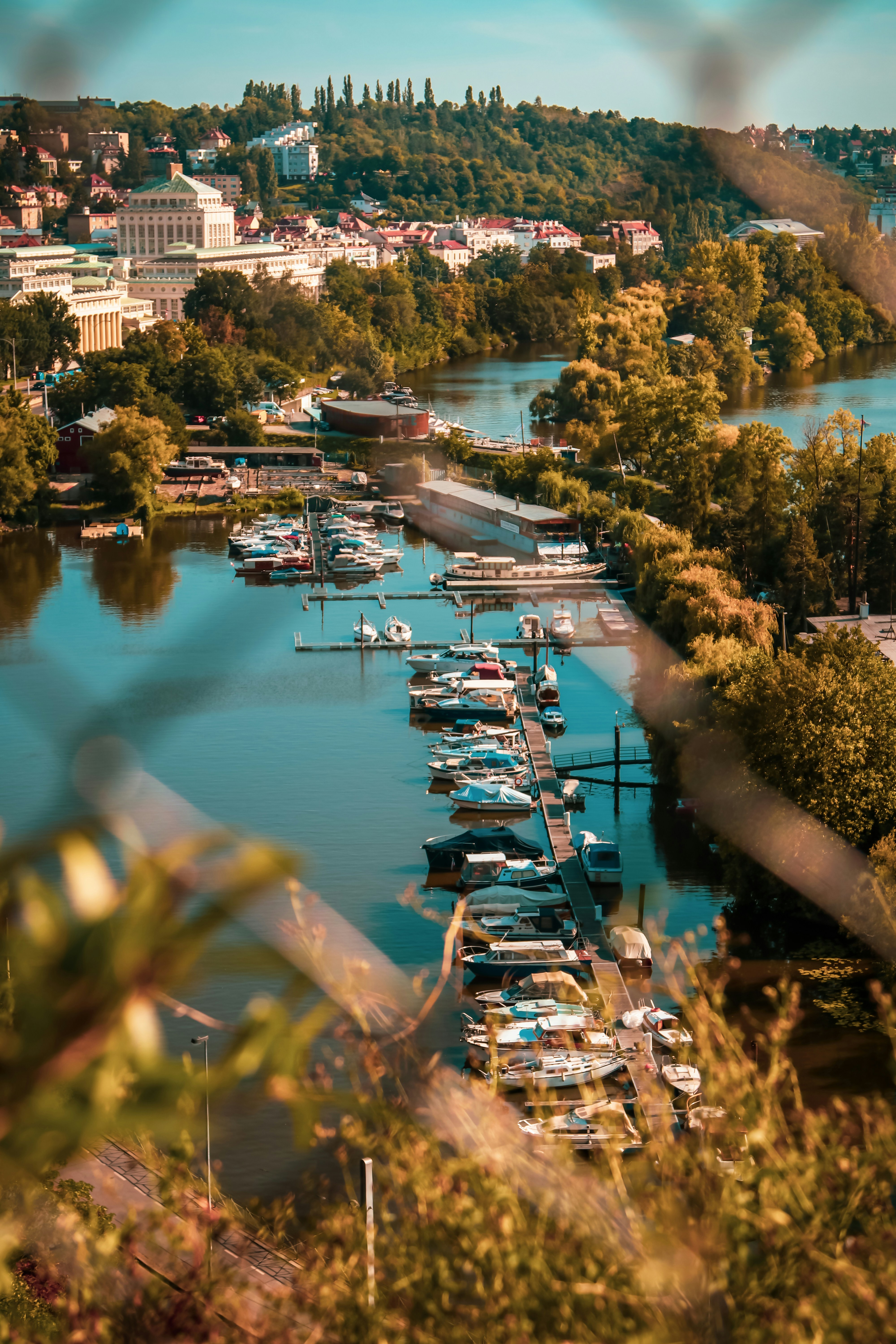 a harbor filled with lots of boats next to a lush green hillside