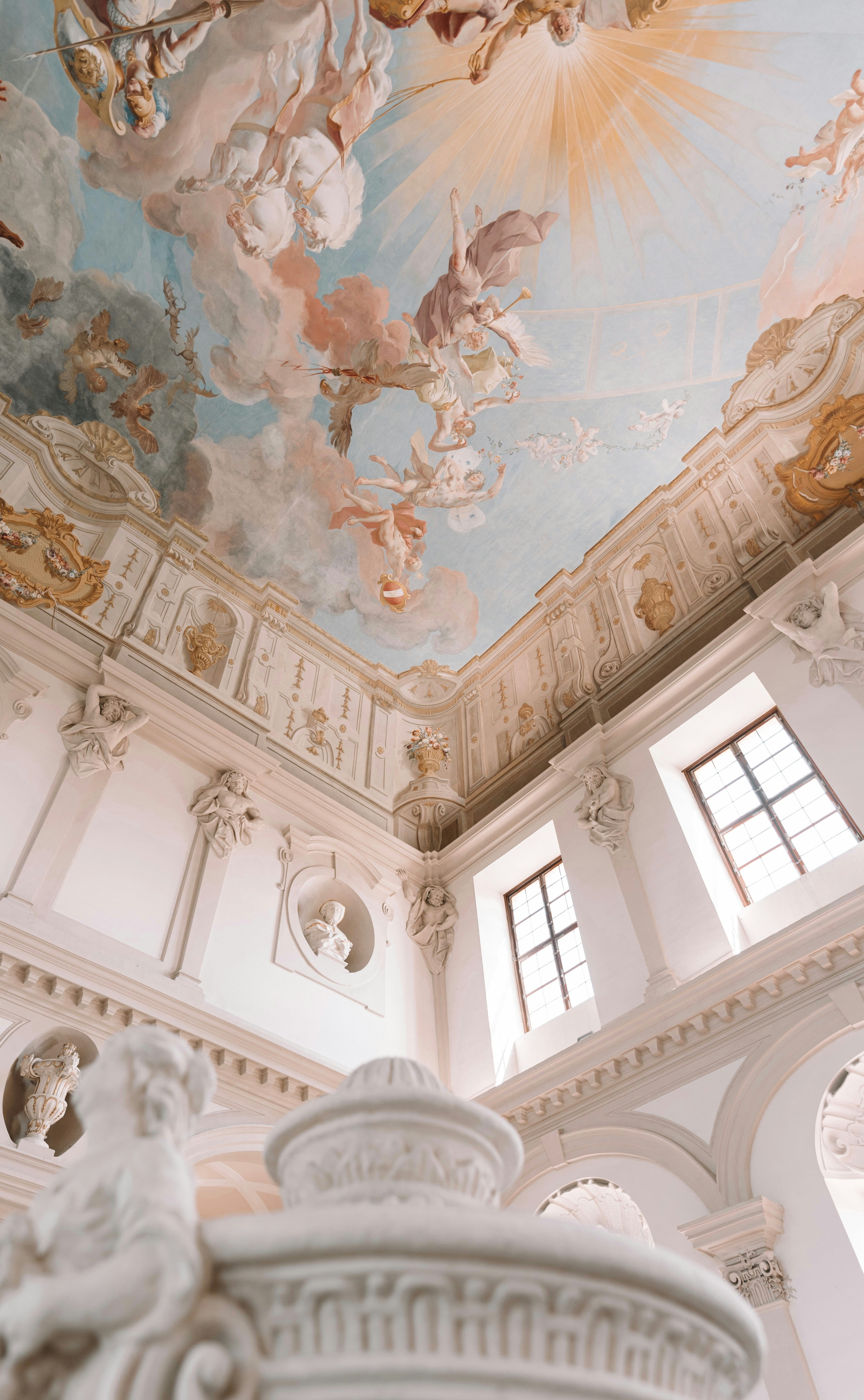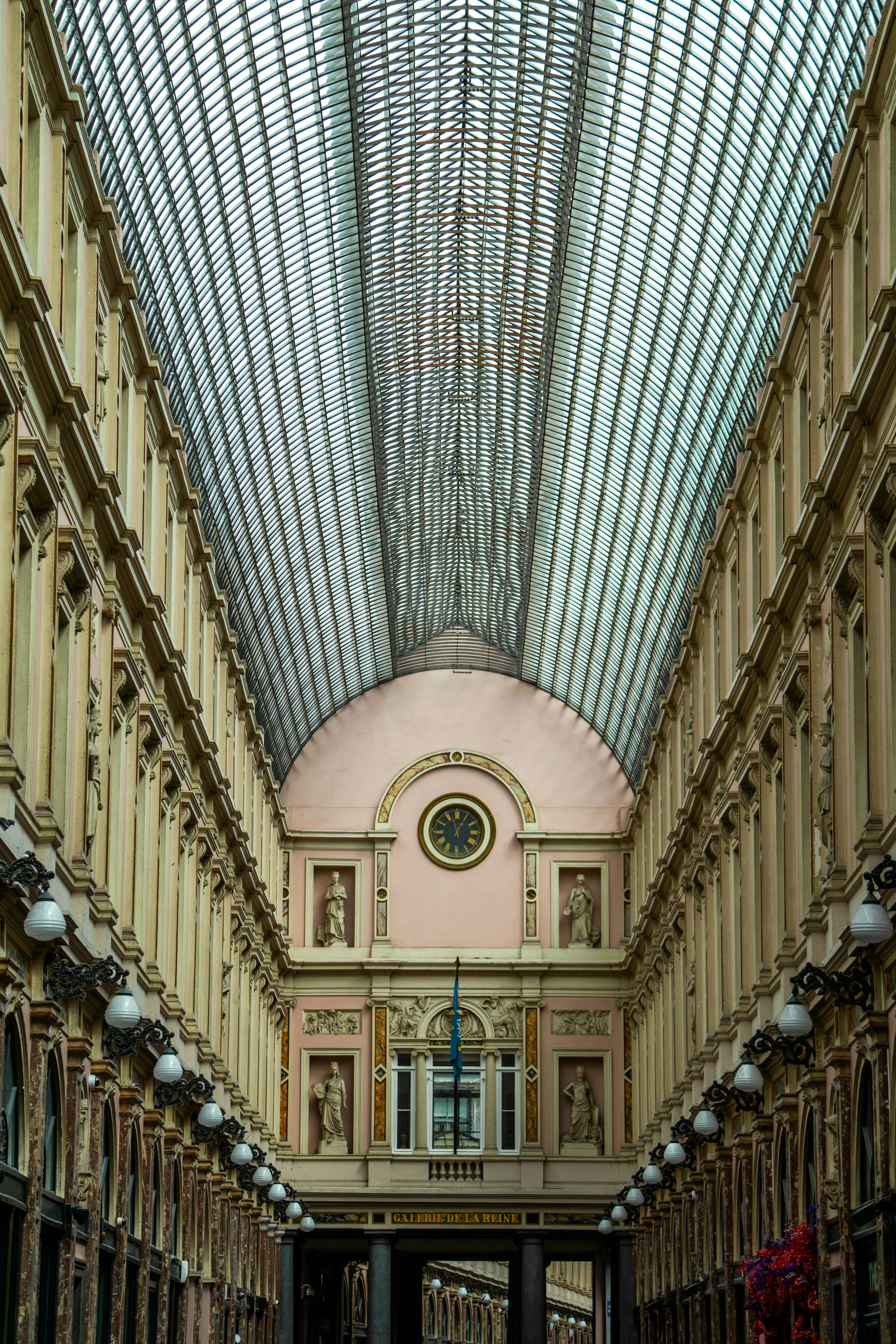 A glass-roofed hallway in an elegant building.